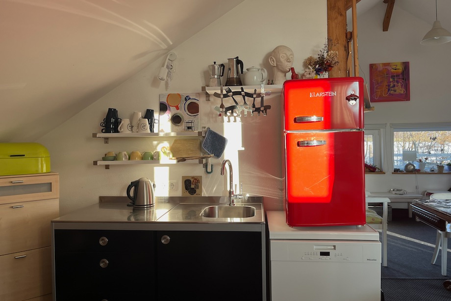 Die praktische Küchenzeile, ohne Backofen, aber mit Induktionsherd, ein kleiner Kühlschrank mit Tiefkühler, und ein gemütliches Tageslichtbad, mit Dusche, WC und Waschmaschine laden Euch ein, sehr ruhige, entspannende und erholsame Tage und Nächte zu verbringen. Wir bieten Euch einen Kaffeevollautomaten oder auch einfache italienische Bialettis, Teekannen und reichlich schönes Geschirr.